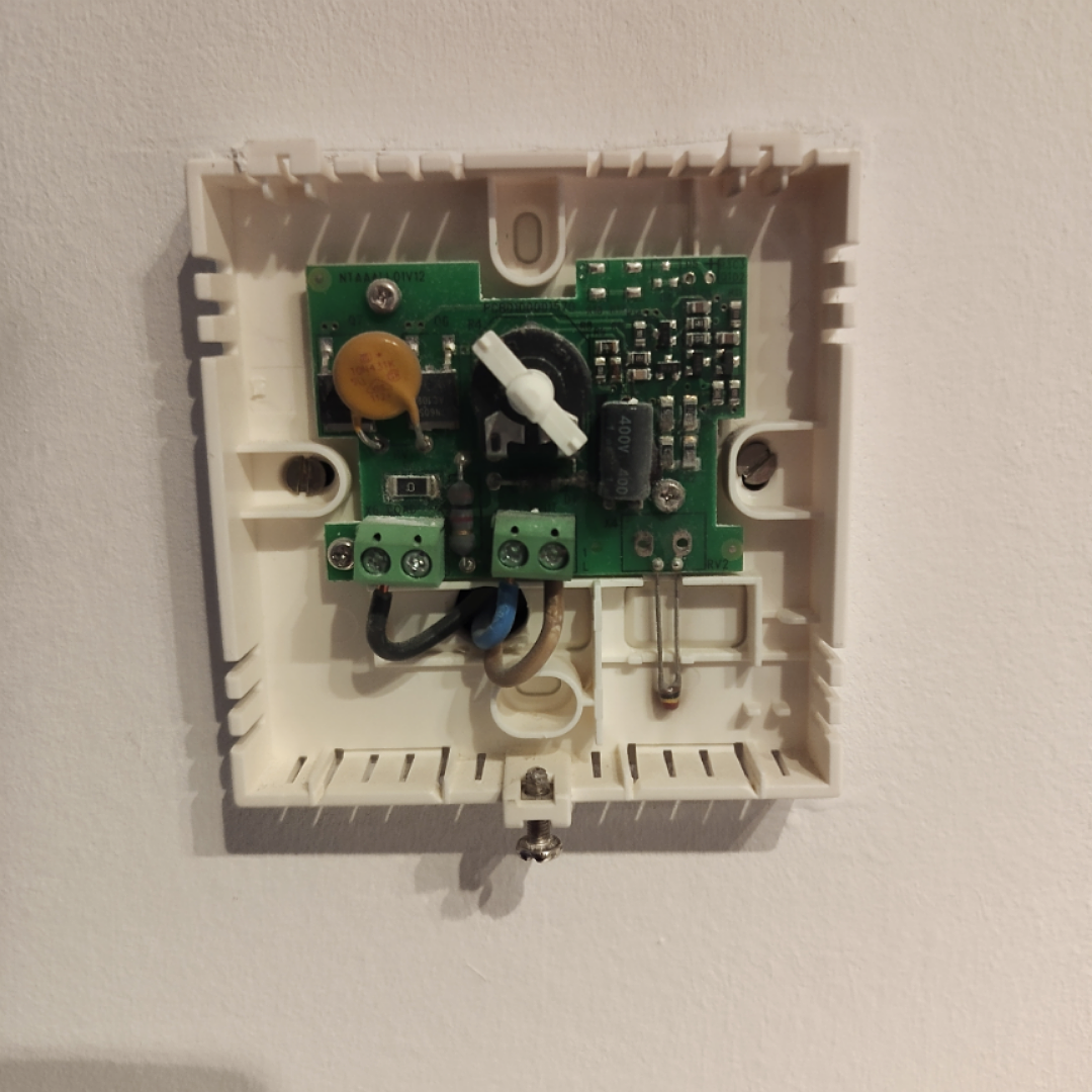 Im Eingangsbereich war auch ein Thermostat verbaut. Das haben wir aber nie benutzt und es lief auf Frostschutz. Das habe ich auch rausgeschmissen und die Dose für den Einbau eines Walldisplay benutzt. L & N werden für das WD gebraucht. Das geschaltene L zum Ventil ist abgeklemmt und stromlos.