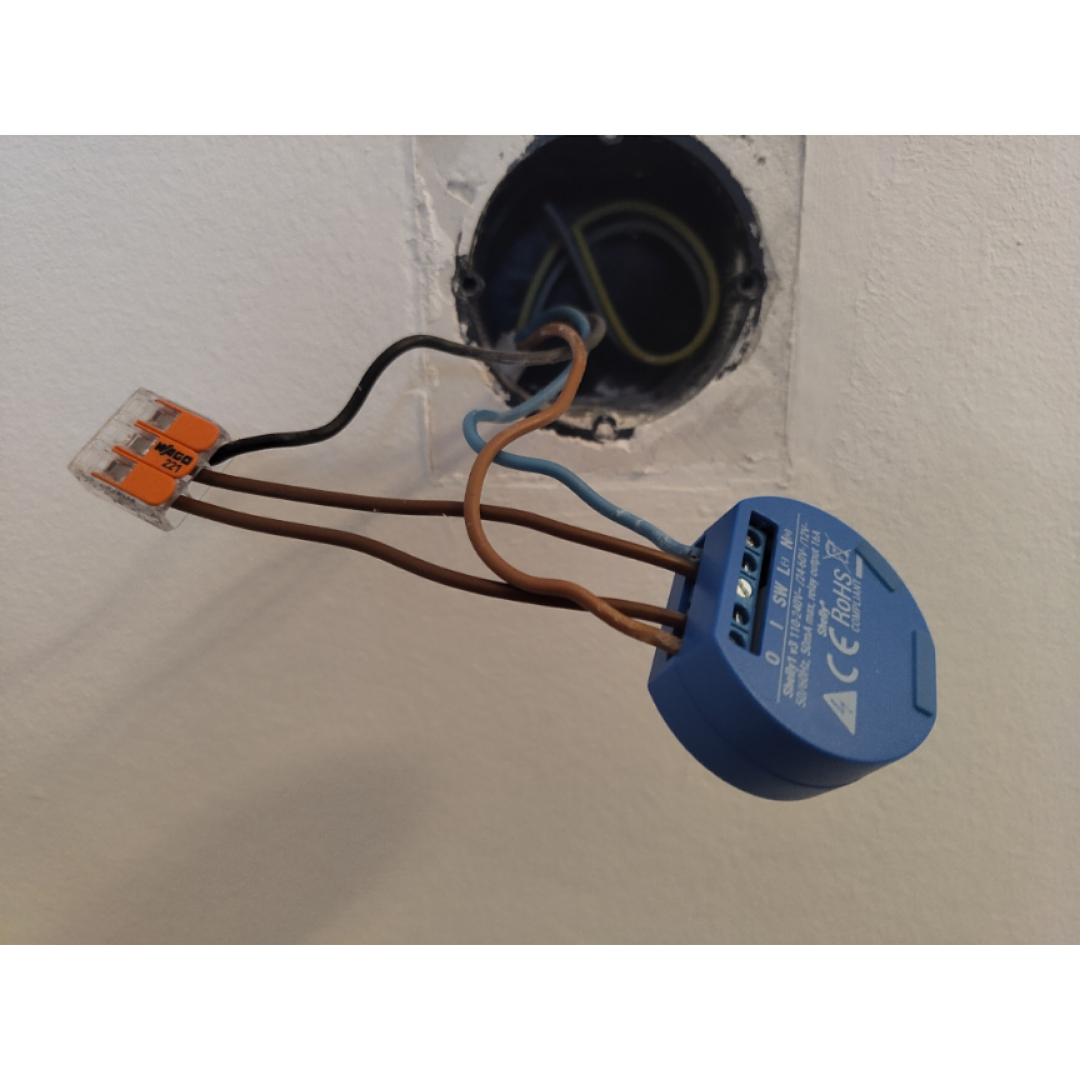 Oben in der Dose ist das alles schon da und nur das ankommende L muss aufgeteilt werden, weil der Shelly1 potentialfrei ist und deshalb zweimal L braucht (Versorgung und Schaltkontakt sind elektrisch getrennt).