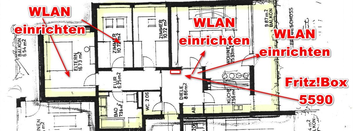 Ich benötige heute eure geschätzte Hilfe. Ich möchte in meiner Wohnung ein optimales WLANHEIMNETZ einrichten und komme nicht mehr weiter. Wie bekomme ich in den eingezeichneten Zimmern / Balkon optimale Signalstärke.